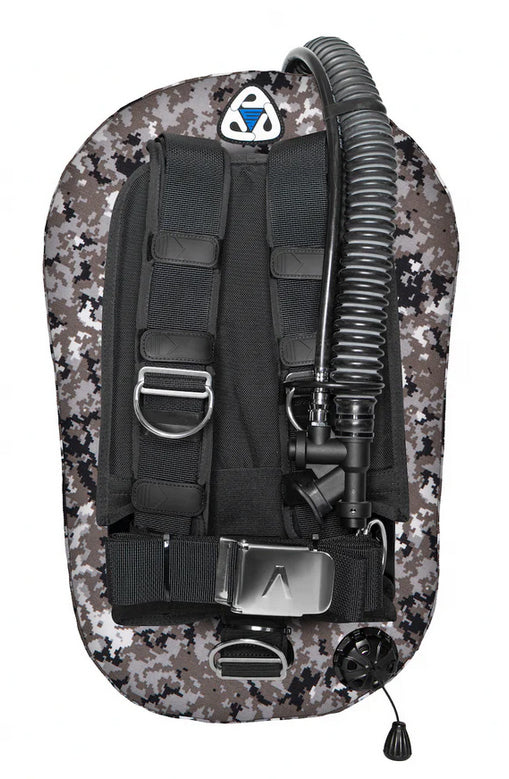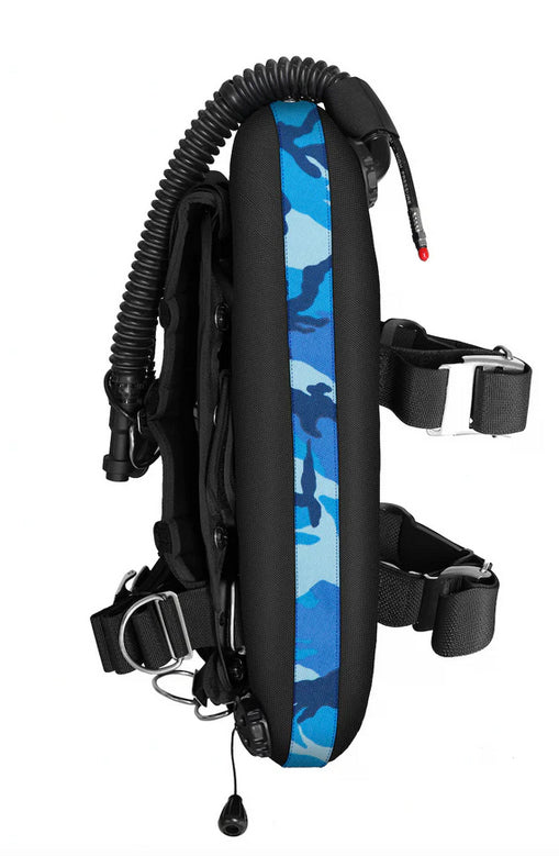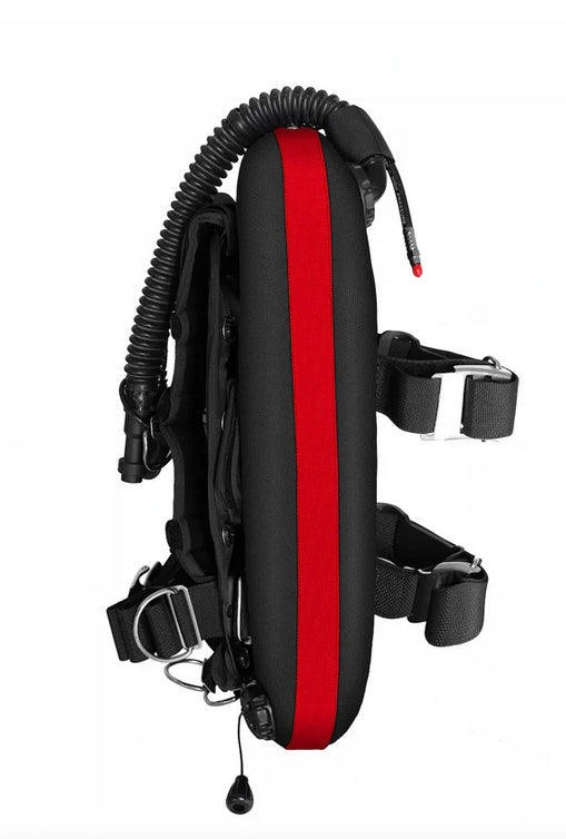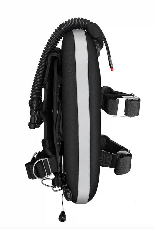 This version is a complete backmount set which includes a single tank donut, stainless steel D-rings, a standard harness, two tank straps with silver buckles. Equipped with soft shoulder and back pads, divers can wear this version without any suit in tropical waters. Carefully tailored shapes support reduced drag and greater in-water efficiency. The harness is a one-size-fits-all system for a customized fit.