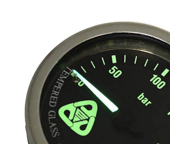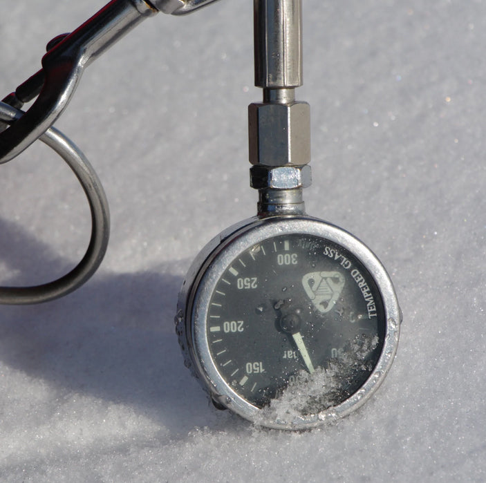 Hippo 2 is a high-quality stainless steel submersible pressure gauge with a black face to help reduce glare and to preserve night vision in low-light environments, i.e. inside a cave or wreck.