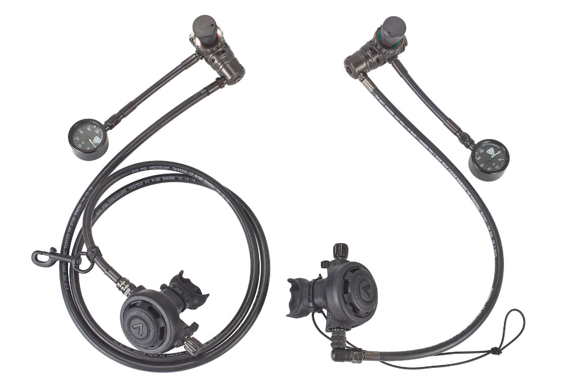 AKUANA sidemount regulator package is designed for divers who seek streamlined and redundant diving system which is not stressing your back. This system is also essential for exploring restrictions in the caves or wrecks. You can customize your gears to suit you.  Our package is preassembled and tested. This saves you a lot of troubles