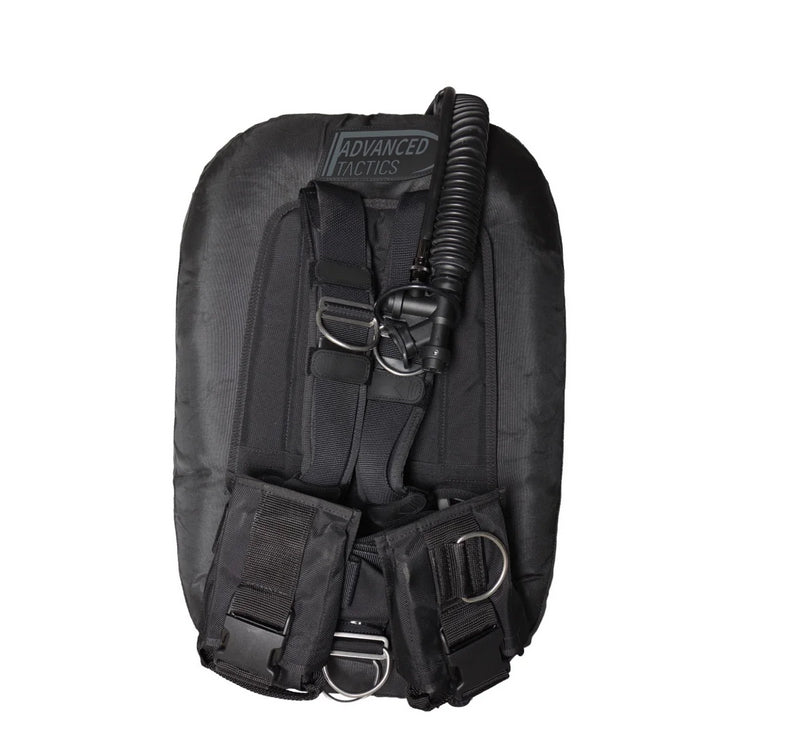 This buoyancy controller is designed for unit diving training, made of non-reflective black material. The backplate and metal rings are constructed from titanium alloy, providing overall low magnetic properties. The bladder is made of bulletproof Dyneema fabric, offering resistance to knife cuts for enhanced reliability and safety. It includes multiple weight pockets for flexible center of gravity adjustment, suitable for training in cold water environments. The bladder size can be flexibly chosen to support single or multiple cylinder tasks.